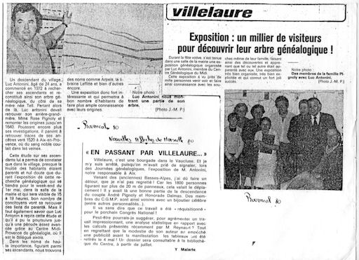 Alors, pour partager ses découvertes, Luc va tracer cet arbre sur de grandes feuilles de dessin et en 1980, avec l'aide du maire de Villelaure, Bernard Devé, et Paulette Halin, épouse Pignoly, secrétaire de mairie, une exposition est réalisée dans la salle de la mairie pendant la fête votive. ![]() De grands panneaux manuscrits retracent ce gigantesque travail de fourmi, et pour les visiteurs, Luc écrit de petits livrets, Thérèse Pignoly dite "Pig", céramiste, lui dessine les couvertures. La grande révélation pour les habitants de Villelaure qui découvrent leur lien de parenté! L'aventure ne fait que commencer. |