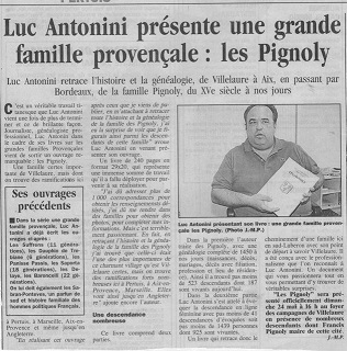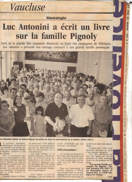 | Luc continue ses recherches et les petits livrets deviennent "livre". 24 Mai 1998, première grande réunion de famille, Luc aidé par le maire de Villelaure, Francis Pignoly, présente son ouvrage consacré à cette grande famille provençale |